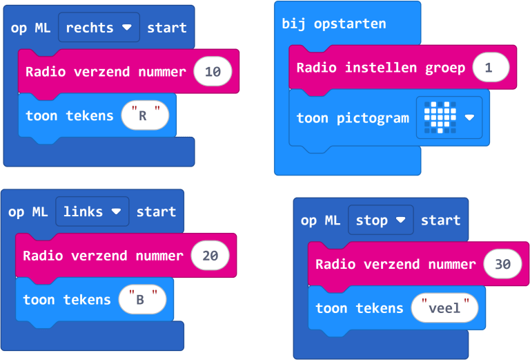 - Kies dan edit in MakeCode en gebruik bijvoorbeeld de onderstaande code waar je een opstart blok toevoeg en hierin het radio blok toevoeg. Natuurlijk moet je ook 3 verschilende radio verzend nummers toevoegen bij de 3 data bloks.